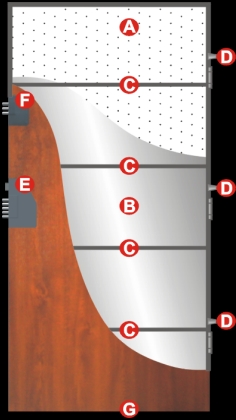 PN-EN 14351-1 wraz z możliwością przeszkleń. Skrzydło o grubości 56 mm zbudowane jest z blachy stalowej (grubości 0,5-0,7mm) pokrytej laminatem PCV w kolorach drewnopodobnych, wypełnione styropianem oraz wyposażone w dwa zamki w tym podklamkowy (na wkładkę zębatkową) DELTA DD6H/Z klasy C i klasy 7.