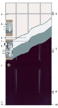 parametrów użytkowych tego produktu. Ozdobne panele pokrywające płat drzwiowy z obydwu stron zapewniają bardzo dobre parametry izolacji termicznej i akustycznej. Istnieje zawsze możliwość wymiany uszkodzonych paneli. Dwa atestowane w klasie C zamki, sztywny łańcuch oraz zbrojona stalowa konstrukcja wewnętrzna zapewniają wysoki stopień bezpieczeństwa.